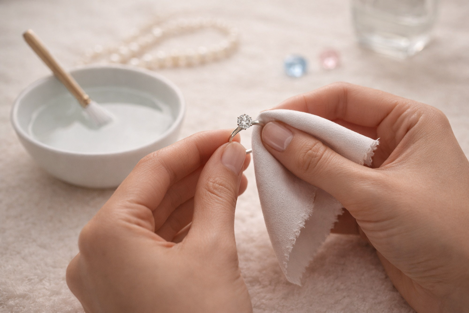 To clean your diamond jewellery at home, use warm water and a small amount of mild dish soap. Gently remove any buildup around the setting with a soft cloth, cotton swab, or soft-bristled toothbrush. Avoid using coarse brushes or applying excessive pressure, as this may scratch the gold setting. After cleaning, rinse with water and dry your jewellery thoroughly to prevent water marks on the metal.